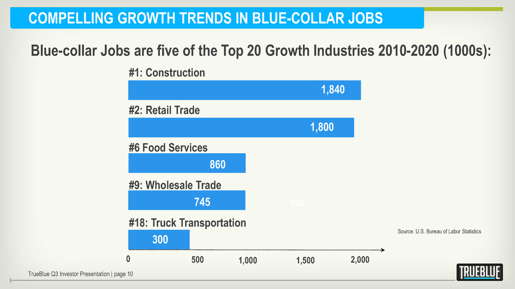 STRONG GROWTH PROJECTED FOR BLUE-COLLAR STAFFING Source: Staffing Industry Analysts, Moody’s economic forecasts, TrueBlue estimates 2012 2016 $35 BILLION $28 BILLION Market Market Forecast TrueBlue Q3 Investor Presentation | page 9