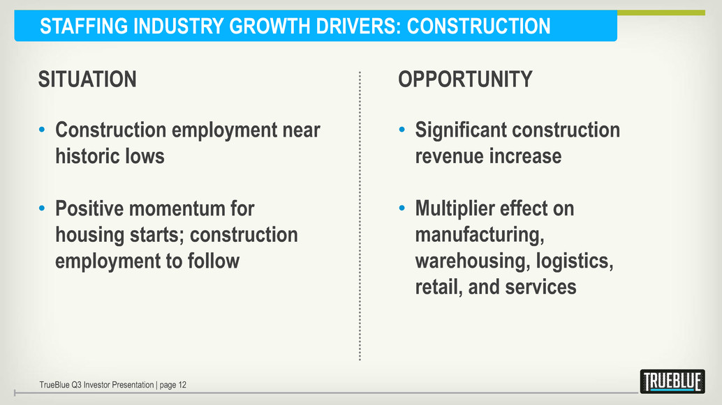 STAFFING INDUSTRY GROWTH DRIVERS: CONSTRUCTION • Construction employment near historic lows • Positive momentum for housing starts; construction employment to follow • Significant construction revenue increase • Multiplier effect on manufacturing, warehousing, logistics, retail, and services OPPORTUNITY SITUATION TrueBlue Q3 Investor Presentation | page 12