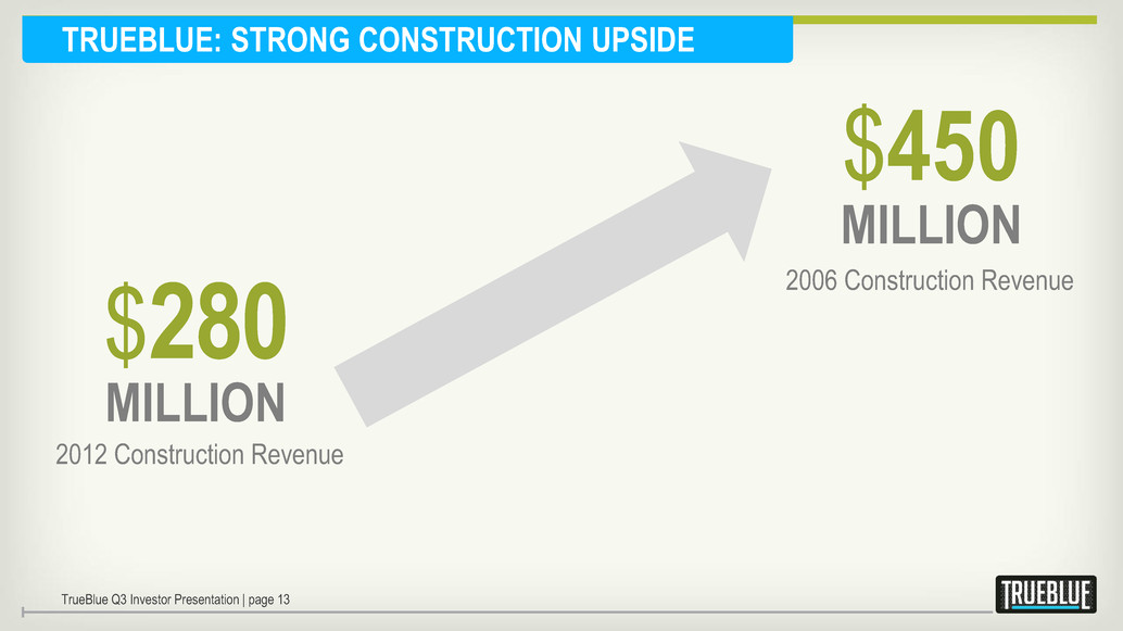 TRUEBLUE: STRONG CONSTRUCTION UPSIDE $450 MILLION $280 MILLION 2012 Construction Revenue TrueBlue Q3 Investor Presentation | page 13 2006 Construction Revenue