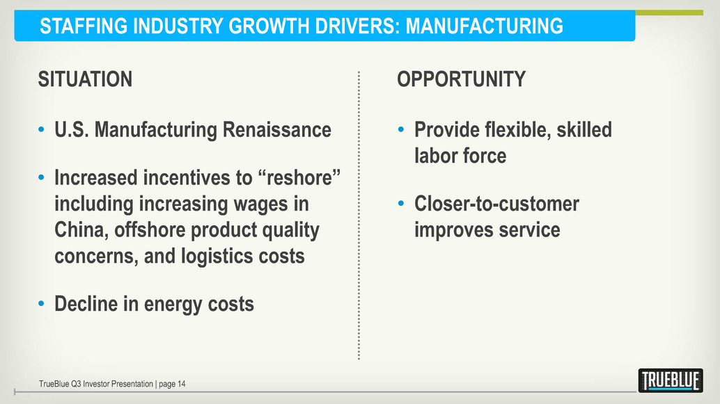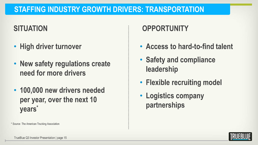 STAFFING INDUSTRY GROWTH DRIVERS: MANUFACTURING • U.S. Manufacturing Renaissance • Increased incentives to “reshore” including increasing wages in China, offshore product quality concerns, and logistics costs • Decline in energy costs • Provide flexible, skilled labor force • Closer-to-customer improves service OPPORTUNITY SITUATION TrueBlue Q3 Investor Presentation | page 14