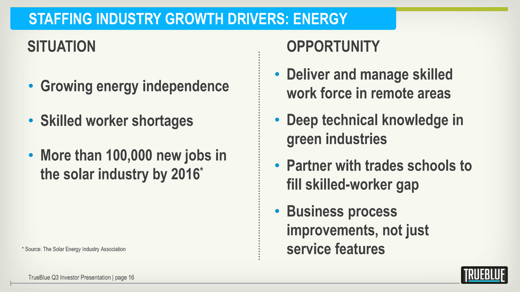 STAFFING INDUSTRY GROWTH DRIVERS: TRANSPORTATION • High driver turnover • New safety regulations create need for more drivers • 100,000 new drivers needed per year, over the next 10 years* • Access to hard-to-find talent • Safety and compliance leadership • Flexible recruiting model • Logistics company partnerships * Source: The American Trucking Association OPPORTUNITY SITUATION TrueBlue Q3 Investor Presentation | page 15