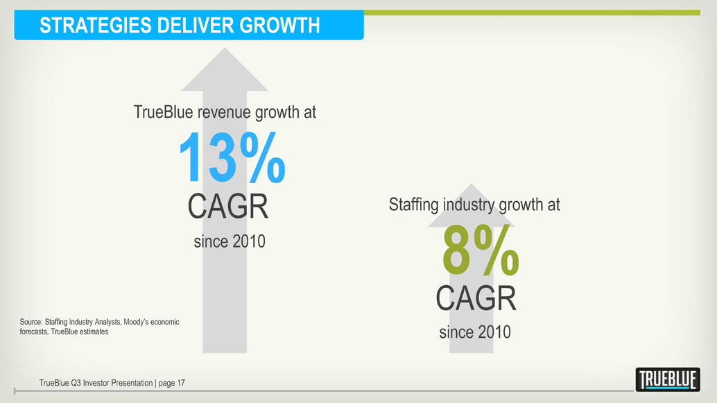 STAFFING INDUSTRY GROWTH DRIVERS: ENERGY • Growing energy independence • Skilled worker shortages • More than 100,000 new jobs in the solar industry by 2016* • Deliver and manage skilled work force in remote areas • Deep technical knowledge in green industries • Partner with trades schools to fill skilled-worker gap • Business process improvements, not just service features OPPORTUNITY SITUATION * Source: The Solar Energy Industry Association TrueBlue Q3 Investor Presentation | page 16