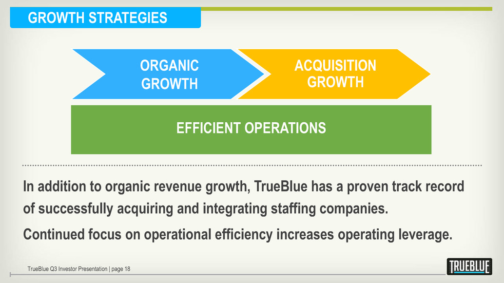 STRATEGIES DELIVER GROWTH Source: Staffing Industry Analysts, Moody’s economic forecasts, TrueBlue estimates CAGR 13% TrueBlue revenue growth at TrueBlue Q3 Investor Presentation | page 17 8% Staffing industry growth at CAGR since 2010 since 2010