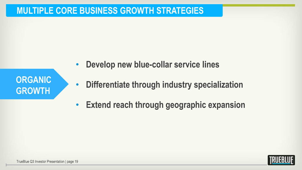 ACQUISITION GROWTH GROWTH STRATEGIES In addition to organic revenue growth, TrueBlue has a proven track record of successfully acquiring and integrating staffing companies. Continued focus on operational efficiency increases operating leverage. ORGANIC GROWTH TrueBlue Q3 Investor Presentation | page 18 EFFICIENT OPERATIONS