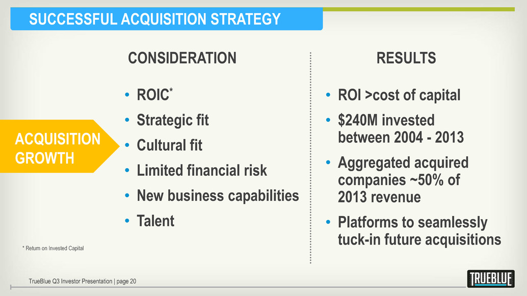MULTIPLE CORE BUSINESS GROWTH STRATEGIES TrueBlue Q3 Investor Presentation | page 19 • Develop new blue-collar service lines • Differentiate through industry specialization • Extend reach through geographic expansion ORGANIC GROWTH