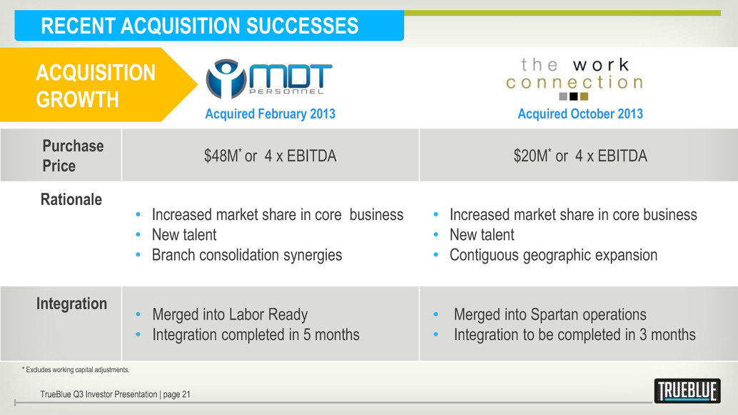 SUCCESSFUL ACQUISITION STRATEGY RESULTS CONSIDERATION • ROIC* • Strategic fit • Cultural fit • Limited financial risk • New business capabilities • Talent • ROI >cost of capital • $240M invested between 2004 - 2013 • Aggregated acquired companies ~50% of 2013 revenue • Platforms to seamlessly tuck-in future acquisitions * Return on Invested Capital TrueBlue Q3 Investor Presentation | page 20 ACQUISITION GROWTH
