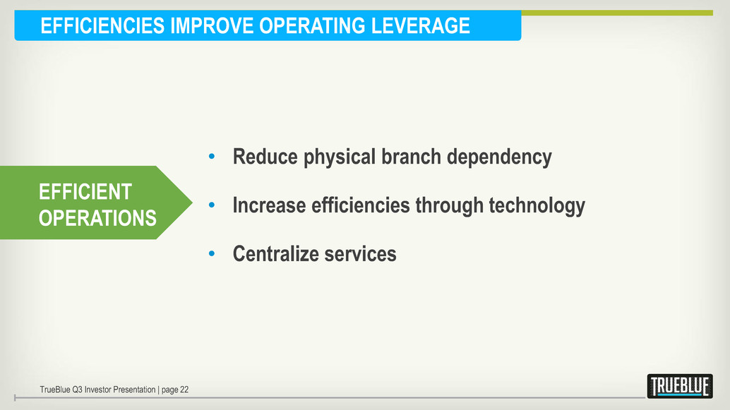 EFFICIENCIES IMPROVE OPERATING LEVERAGE TrueBlue Q3 Investor Presentation | page 22 • Reduce physical branch dependency • Increase efficiencies through technology • Centralize services EFFICIENT OPERATIONS