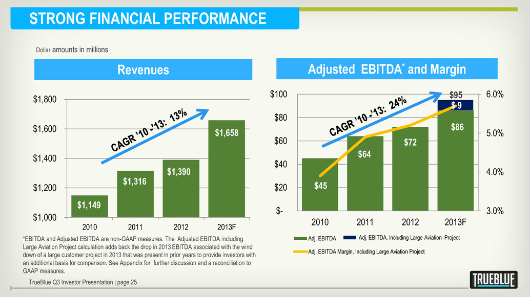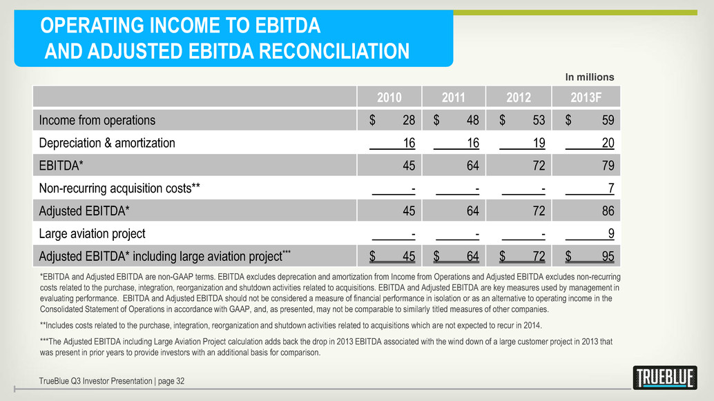 OPERATING INCOME TO EBITDA AND ADJUSTED EBITDA RECONCILIATION In millions *EBITDA and Adjusted EBITDA are non-GAAP terms. EBITDA excludes deprecation and amortization from Income from Operations and Adjusted EBITDA excludes non-recurring costs related to the purchase, integration, reorganization and shutdown activities related to acquisitions. EBITDA and Adjusted EBITDA are key measures used by management in evaluating performance. EBITDA and Adjusted EBITDA should not be considered a measure of financial performance in isolation or as an alternative to operating income in the Consolidated Statement of Operations in accordance with GAAP, and, as presented, may not be comparable to similarly titled measures of other companies. **Includes costs related to the purchase, integration, reorganization and shutdown activities related to acquisitions which are not expected to recur in 2014. ***The Adjusted EBITDA including Large Aviation Project calculation adds back the drop in 2013 EBITDA associated with the wind down of a large customer project in 2013 that was present in prior years to provide investors with an additional basis for comparison. TrueBlue Q3 Investor Presentation | page 32 2010 2011 2012 2013F Income from operations $ 28 $ 48 $ 53 $ 59 Depreciation & amortization 16 16 19 20 EBITDA* 45 64 72 79 Non-recurring acquisition costs** - - - 7 Adjusted EBITDA* 45 64 72 86 Large aviation project - - - 9 Adjusted EBITDA* including large aviation project*** $ 45 $ 64 $ 72 $ 95