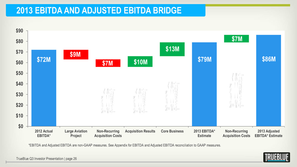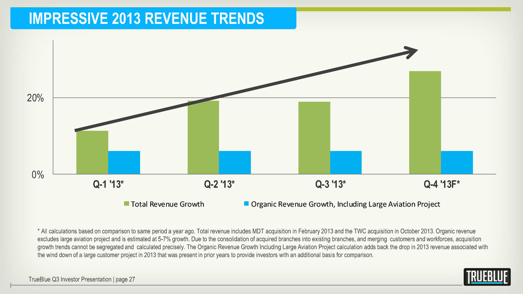 $0 $10 $20 $30 $40 $50 $60 $70 $80 $90 2012 Actual EBITDA* Large Aviation Project Non-Recurring Acquisition Costs Acquisition Results Core Business 2013 EBITDA* Estimate Non-Recurring Acquisition Costs 2013 Adjusted EBITDA* Estimate $72M $9M $10M $13M 2013 EBITDA AND ADJUSTED EBITDA BRIDGE $79M $7M $7M $86M TrueBlue Q3 Investor Presentation | page 26 *EBITDA and Adjusted EBITDA are non-GAAP measures. See Appendix for EBITDA and Adjusted EBITDA reconciliation to GAAP measures.