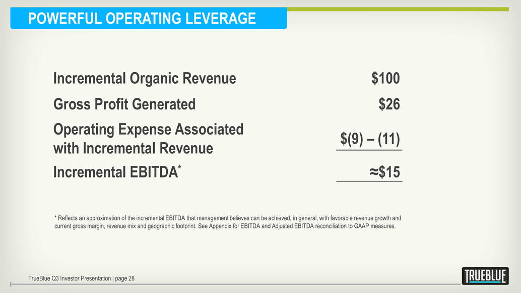 Incremental Organic Revenue $100 Gross Profit Generated $26 Operating Expense Associated with Incremental Revenue $(9) – (11) Incremental EBITDA* ≈$15 * Reflects an approximation of the incremental EBITDA that management believes can be achieved, in general, with favorable revenue growth and current gross margin, revenue mix and geographic footprint. See Appendix for EBITDA and Adjusted EBITDA reconciliation to GAAP measures. POWERFUL OPERATING LEVERAGE TrueBlue Q3 Investor Presentation | page 28