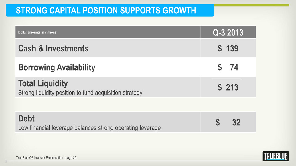 Dollar amounts in millions Q-3 2013 Cash & Investments $ 139 Borrowing Availability $ 74 Total Liquidity Strong liquidity position to fund acquisition strategy $ 213 STRONG CAPITAL POSITION SUPPORTS GROWTH Debt Low financial leverage balances strong operating leverage $ 32 TrueBlue Q3 Investor Presentation | page 29