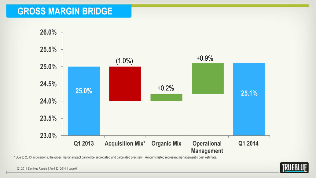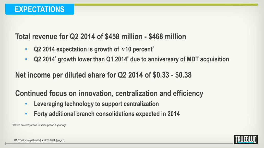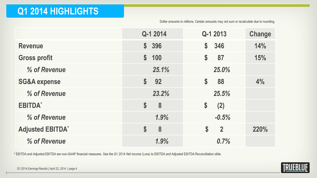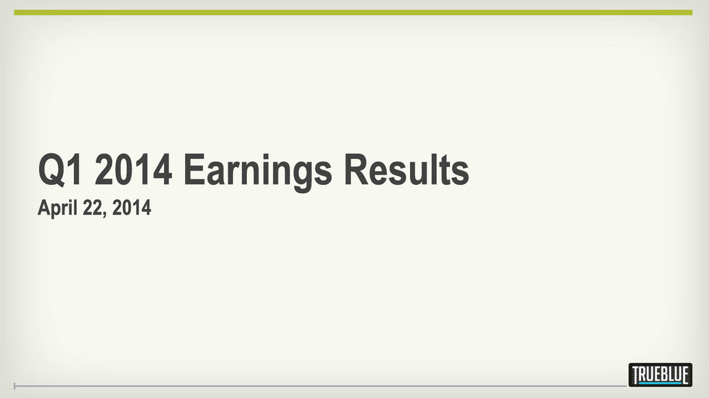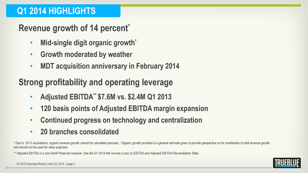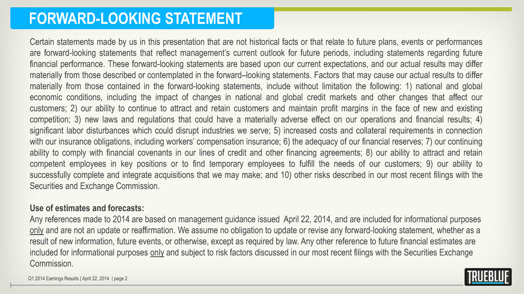 Certain statements made by us in this presentation that are not historical facts or that relate to future plans, events or performances are forward-looking statements that reflect management’s current outlook for future periods, including statements regarding future financial performance. These forward-looking statements are based upon our current expectations, and our actual results may differ materially from those described or contemplated in the forward–looking statements. Factors that may cause our actual results to differ materially from those contained in the forward-looking statements, include without limitation the following: 1) national and global economic conditions, including the impact of changes in national and global credit markets and other changes that affect our customers; 2) our ability to continue to attract and retain customers and maintain profit margins in the face of new and existing competition; 3) new laws and regulations that could have a materially adverse effect on our operations and financial results; 4) significant labor disturbances which could disrupt industries we serve; 5) increased costs and collateral requirements in connection with our insurance obligations, including workers’ compensation insurance; 6) the adequacy of our financial reserves; 7) our continuing ability to comply with financial covenants in our lines of credit and other financing agreements; 8) our ability to attract and retain competent employees in key positions or to find temporary employees to fulfill the needs of our customers; 9) our ability to successfully complete and integrate acquisitions that we may make; and 10) other risks described in our most recent filings with the Securities and Exchange Commission. Use of estimates and forecasts: Any references made to 2014 are based on management guidance issued April 22, 2014, and are included for informational purposes only and are not an update or reaffirmation. We assume no obligation to update or revise any forward-looking statement, whether as a result of new information, future events, or otherwise, except as required by law. Any other reference to future financial estimates are included for informational purposes only and subject to risk factors discussed in our most recent filings with the Securities Exchange Commission. Q1 2014 Earnings Results | April 22, 2014 | page 2 FORWARD-LOOKING STATEMENT