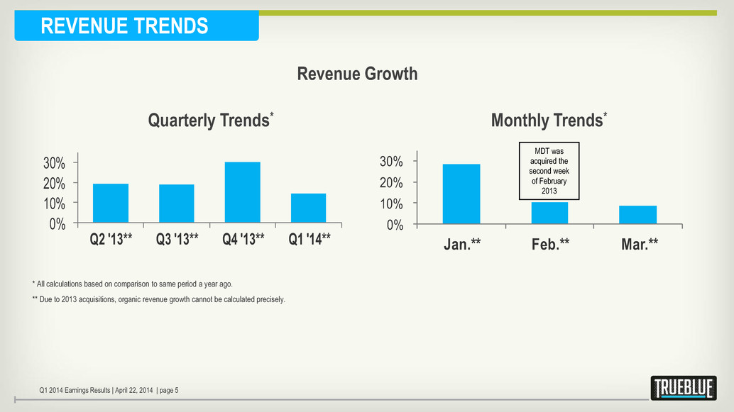 Q1 2014 HIGHLIGHTS Dollar amounts in millions. Certain amounts may not sum or recalculate due to rounding. Q-1 2014 Q-1 2013 Change Revenue $ 396 $ 346 14% Gross profit $ 100 $ 87 15% % of Revenue 25.1% 25.0% SG&A expense $ 92 $ 88 4% % of Revenue 23.2% 25.5% EBITDA* $ 8 $ (2) % of Revenue 1.9% -0.5% Adjusted EBITDA* $ 8 $ 2 220% % of Revenue 1.9% 0.7% * EBITDA and Adjusted EBITDA are non-GAAP financial measures. See the Q1 2014 Net Income (Loss) to EBITDA and Adjusted EBITDA Reconciliation slide. Q1 2014 Earnings Results | April 22, 2014 | page 4