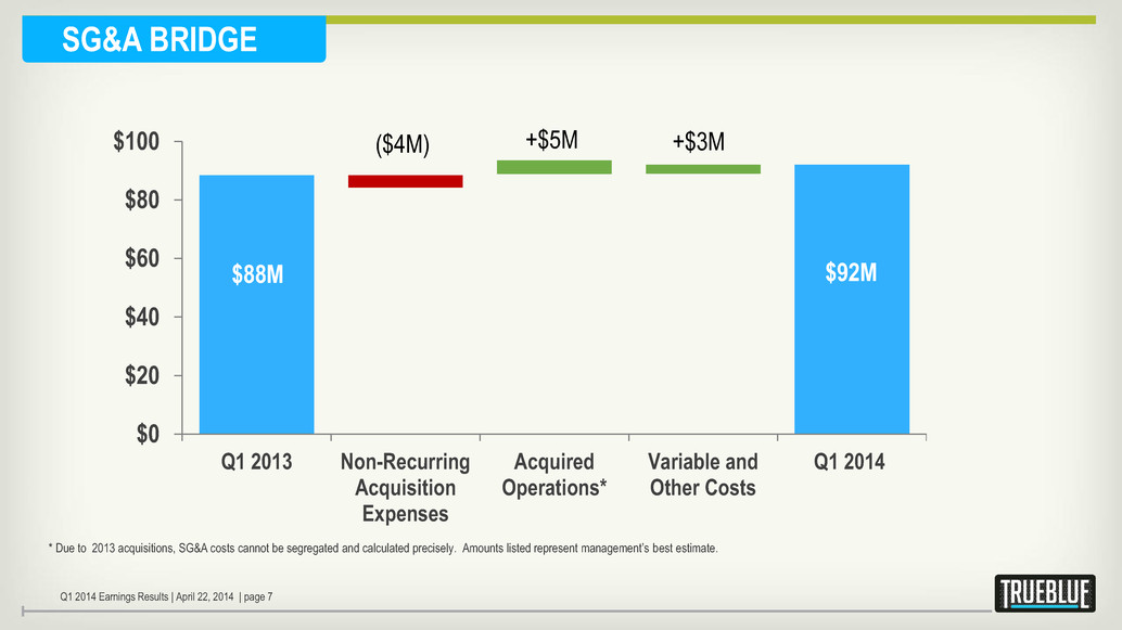 GROSS MARGIN BRIDGE * Due to 2013 acquisitions, the gross margin impact cannot be segregated and calculated precisely. Amounts listed represent management’s best estimate. 23.0% 23.5% 24.0% 24.5% 25.0% 25.5% 26.0% Q1 2013 Acquisition Mix* Organic Mix Operational Management Q1 2014 25.1% (1.0%) +0.9% +0.2% 25.0% Q1 2014 Earnings Results | April 22, 2014 | page 6