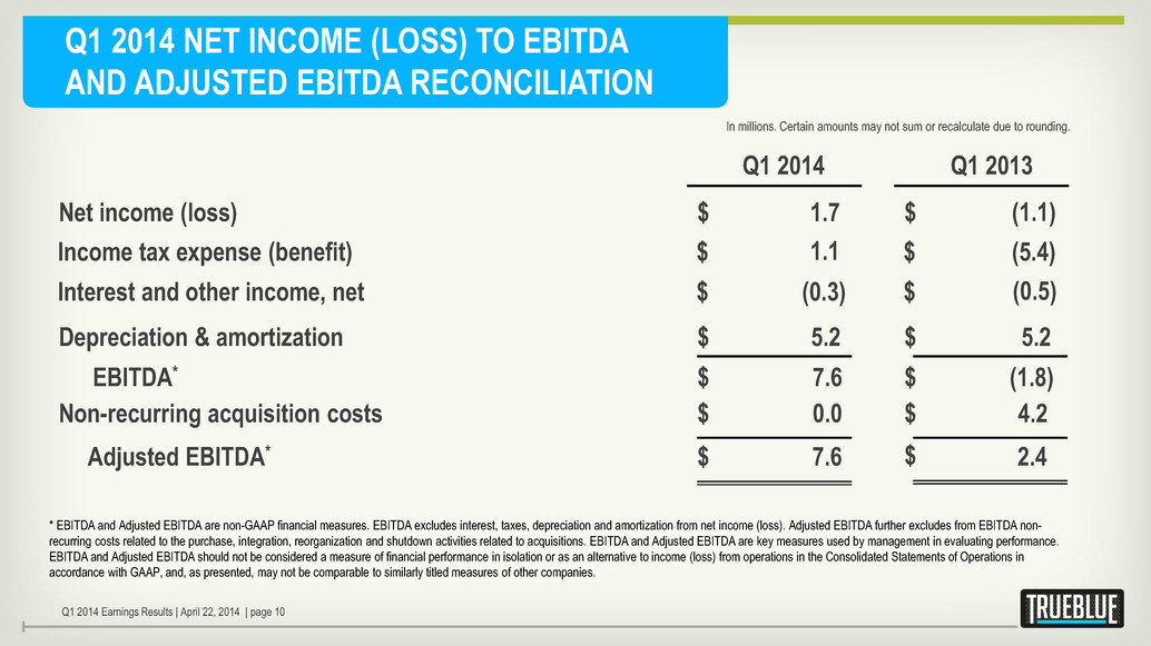 Q1 2014 NET INCOME (LOSS) TO EBITDA AND ADJUSTED EBITDA RECONCILIATION Q1 2014 Net income (loss) 1.7 $ Q1 2013 (1.1) $ In millions. Certain amounts may not sum or recalculate due to rounding. Depreciation & amortization 5.2 $ EBITDA* 7.6 $ Non-recurring acquisition costs 0.0 $ Adjusted EBITDA* 7.6 $ 5.2 $ (1.8) $ 4.2 $ 2.4 $ Income tax expense (benefit) 1.1 $ (5.4) $ Interest and other income, net (0.3) $ (0.5) $ * EBITDA and Adjusted EBITDA are non-GAAP financial measures. EBITDA excludes interest, taxes, depreciation and amortization from net income (loss). Adjusted EBITDA further excludes from EBITDA non- recurring costs related to the purchase, integration, reorganization and shutdown activities related to acquisitions. EBITDA and Adjusted EBITDA are key measures used by management in evaluating performance. EBITDA and Adjusted EBITDA should not be considered a measure of financial performance in isolation or as an alternative to income (loss) from operations in the Consolidated Statements of Operations in accordance with GAAP, and, as presented, may not be comparable to similarly titled measures of other companies. Q1 2014 Earnings Results | April 22, 2014 | page 10