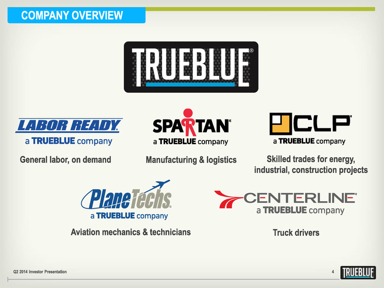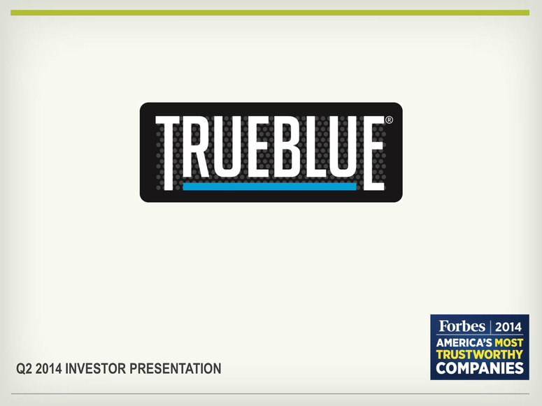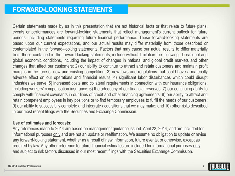 Certain statements made by us in this presentation that are not historical facts or that relate to future plans, events or performances are forward-looking statements that reflect management’s current outlook for future periods, including statements regarding future financial performance. These forward-looking statements are based upon our current expectations, and our actual results may differ materially from those described or contemplated in the forward–looking statements. Factors that may cause our actual results to differ materially from those contained in the forward-looking statements, include without limitation the following: 1) national and global economic conditions, including the impact of changes in national and global credit markets and other changes that affect our customers; 2) our ability to continue to attract and retain customers and maintain profit margins in the face of new and existing competition; 3) new laws and regulations that could have a materially adverse effect on our operations and financial results; 4) significant labor disturbances which could disrupt industries we serve; 5) increased costs and collateral requirements in connection with our insurance obligations, including workers’ compensation insurance; 6) the adequacy of our financial reserves; 7) our continuing ability to comply with financial covenants in our lines of credit and other financing agreements; 8) our ability to attract and retain competent employees in key positions or to find temporary employees to fulfill the needs of our customers; 9) our ability to successfully complete and integrate acquisitions that we may make; and 10) other risks described in our most recent filings with the Securities and Exchange Commission. Use of estimates and forecasts: Any references made to 2014 are based on management guidance issued April 22, 2014, and are included for informational purposes only and are not an update or reaffirmation. We assume no obligation to update or revise any forward-looking statement, whether as a result of new information, future events, or otherwise, except as required by law. Any other reference to future financial estimates are included for informational purposes only and subject to risk factors discussed in our most recent filings with the Securities Exchange Commission.