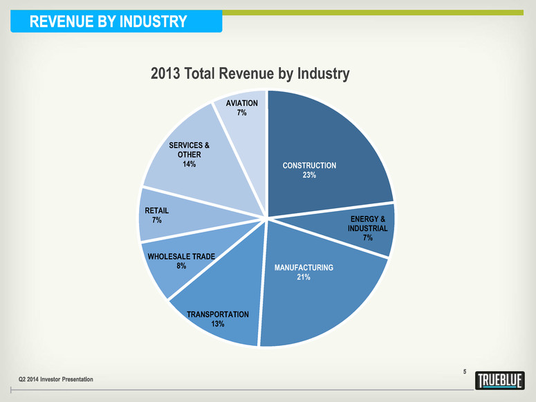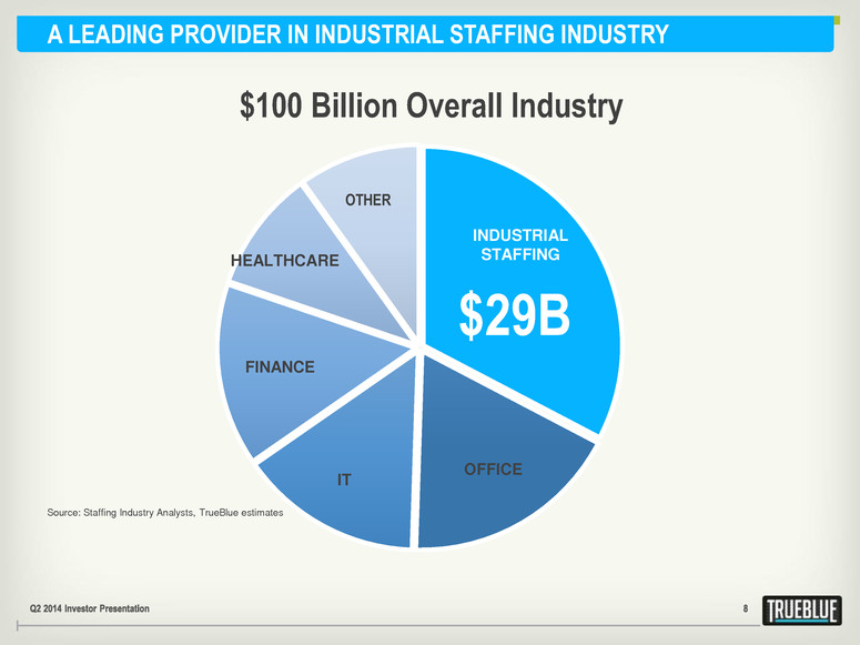 A LEADING PROVIDER IN INDUSTRIAL STAFFING INDUSTRY $100 Billion Overall Industry $29B OFFICE IT FINANCE HEALTHCARE OTHER INDUSTRIAL STAFFING Source: Staffing Industry Analysts, TrueBlue estimates