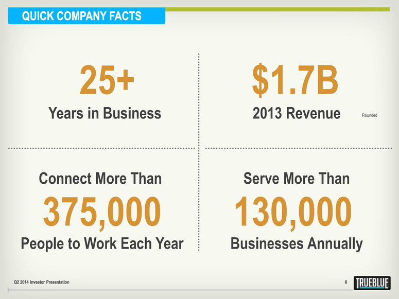 25+ $1.7B Years in Business 2013 Revenue 375,000 Connect More Than People to Work Each Year 130,000 Serve More Than Businesses Annually Rounded
