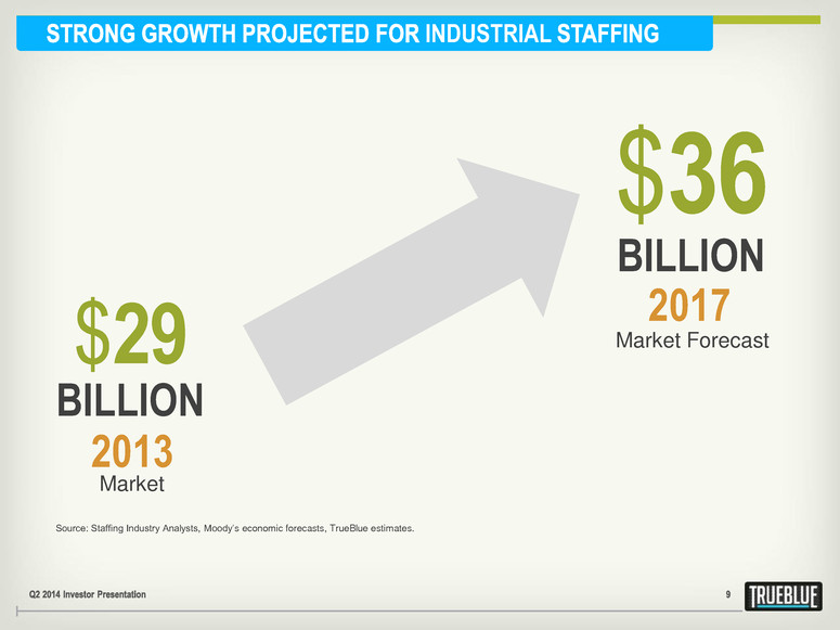 INDUSTRIAL Source: Staffing Industry Analysts, Moody’s economic forecasts, TrueBlue estimates. 2013 2017 $36 BILLION $29 BILLION Market Market Forecast