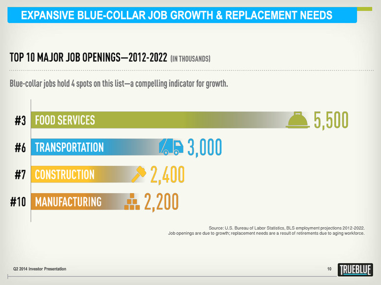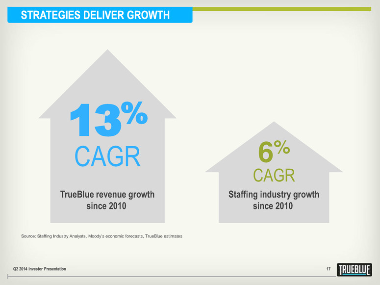 Source: Staffing Industry Analysts, Moody’s economic forecasts, TrueBlue estimates 13% CAGR 6% CAGR TrueBlue revenue growth since 2010 Staffing industry growth since 2010