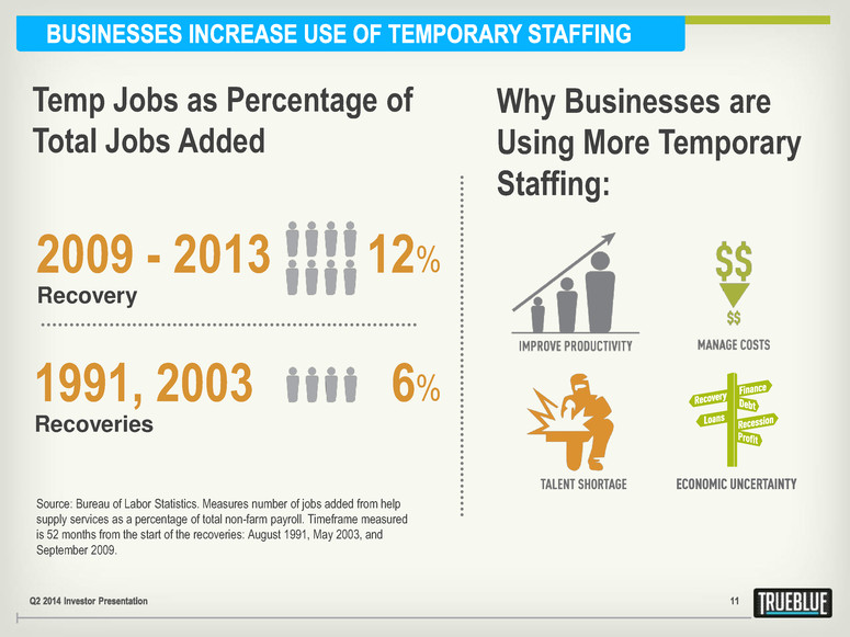 Why Businesses are Using More Temporary Staffing: Source: Bureau of Labor Statistics. Measures number of jobs added from help supply services as a percentage of total non-farm payroll. Timeframe measured is 52 months from the start of the recoveries: August 1991, May 2003, and September 2009. Temp Jobs as Percentage of Total Jobs Added 1991, 2003 Recoveries 6% 2009 - 2013 Recovery 12%