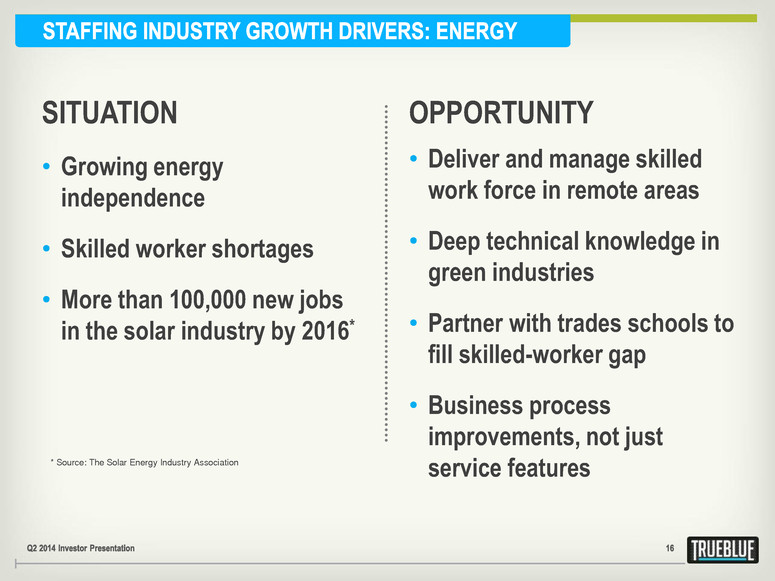 SITUATION • Growing energy independence • Skilled worker shortages • More than 100,000 new jobs in the solar industry by 2016* OPPORTUNITY • Deliver and manage skilled work force in remote areas • Deep technical knowledge in green industries • Partner with trades schools to fill skilled-worker gap • Business process improvements, not just service features * Source: The Solar Energy Industry Association