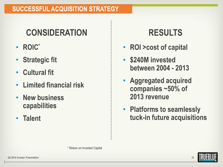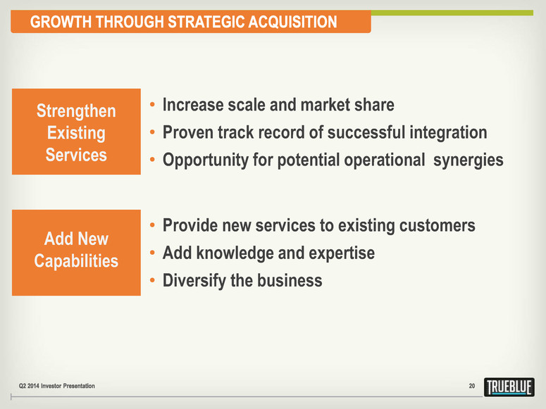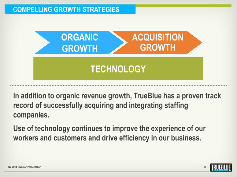 ACQUISITION GROWTH COMPELLING In addition to organic revenue growth, TrueBlue has a proven track record of successfully acquiring and integrating staffing companies. Use of technology continues to improve the experience of our workers and customers and drive efficiency in our business. ORGANIC GROWTH TECHNOLOGY
