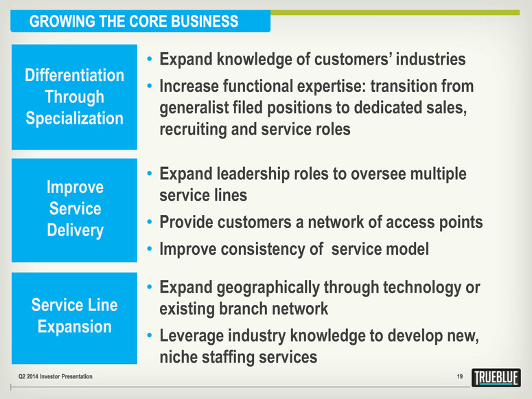 • Expand knowledge of customers’ industries • Increase functional expertise: transition from generalist filed positions to dedicated sales, recruiting and service roles Differentiation Through Specialization Improve Service Delivery Service Line Expansion • Expand geographically through technology or existing branch network • Leverage industry knowledge to develop new, niche staffing services • Expand leadership roles to oversee multiple service lines • Provide customers a network of access points • Improve consistency of service model