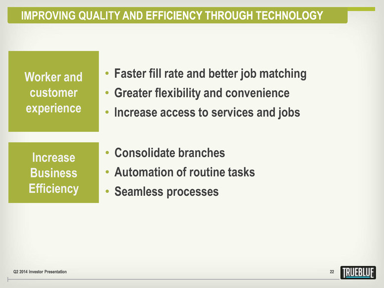 IMPROVING QUALITY AND • Faster fill rate and better job matching • Greater flexibility and convenience • Increase access to services and jobs Worker and customer experience • Consolidate branches • Automation of routine tasks • Seamless processes Increase Business Efficiency
