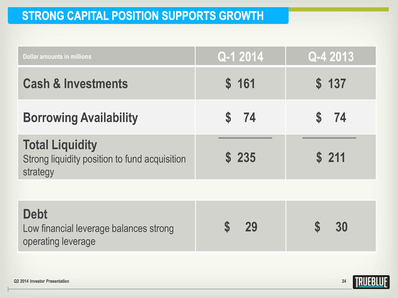 Dollar amounts in millions Q-1 2014 Q-4 2013 Cash & Investments $ 161 $ 137 Borrowing Availability $ 74 $ 74 Total Liquidity Strong liquidity position to fund acquisition strategy $ 235 $ 211 Debt Low financial leverage balances strong operating leverage $ 29 $ 30