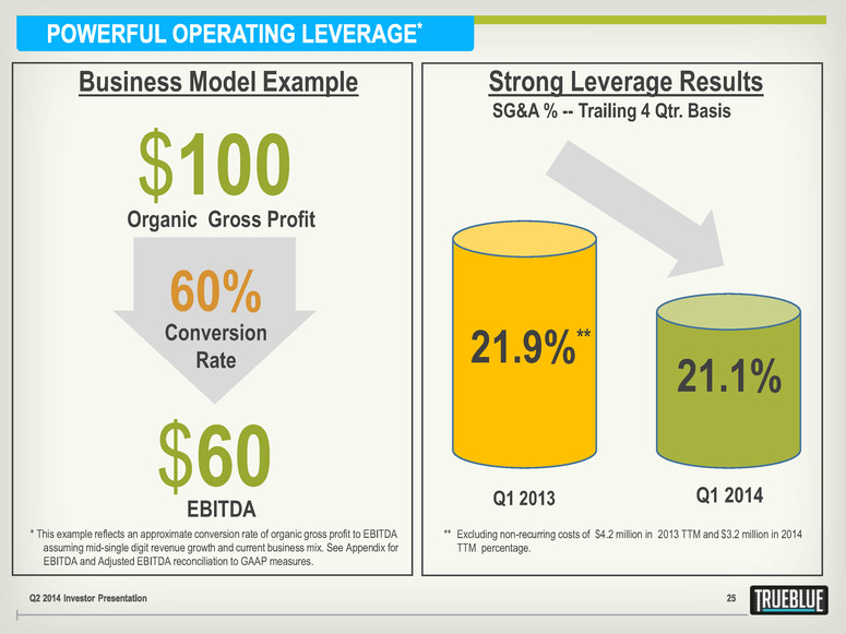 * This example reflects an approximate conversion rate of organic gross profit to EBITDA assuming mid-single digit revenue growth and current business mix. See Appendix for EBITDA and Adjusted EBITDA reconciliation to GAAP measures. 60% $100 Conversion Rate $60 Organic Gross Profit EBITDA 21.1% 21.9%** ** Excluding non-recurring costs of $4.2 million in 2013 TTM and $3.2 million in 2014 TTM percentage. Q1 2014 Business Model Example Strong Leverage Results SG&A % -- Trailing 4 Qtr. Basis Q1 2013