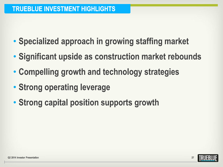 • Specialized approach in growing staffing market • Significant upside as construction market rebounds • Compelling growth and technology strategies • Strong operating leverage • Strong capital position supports growth