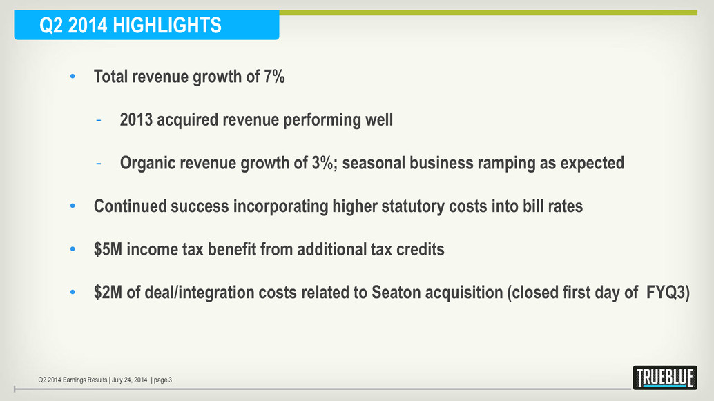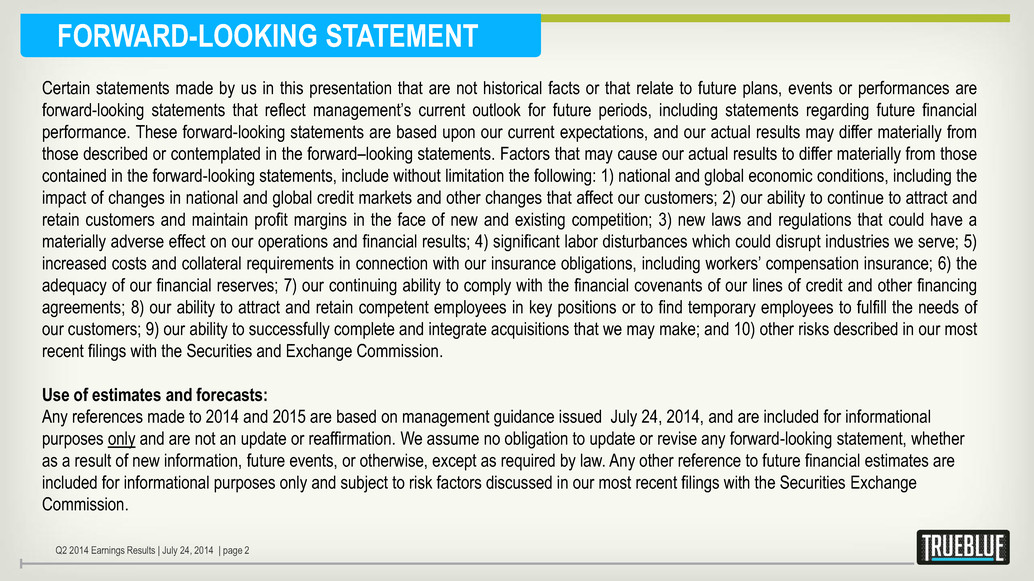 Q2 2014 Earnings Results | July 24, 2014 | page 2 FORWARD-LOOKING STATEMENT Certain statements made by us in this presentation that are not historical facts or that relate to future plans, events or performances are forward-looking statements that reflect management’s current outlook for future periods, including statements regarding future financial performance. These forward-looking statements are based upon our current expectations, and our actual results may differ materially from those described or contemplated in the forward–looking statements. Factors that may cause our actual results to differ materially from those contained in the forward-looking statements, include without limitation the following: 1) national and global economic conditions, including the impact of changes in national and global credit markets and other changes that affect our customers; 2) our ability to continue to attract and retain customers and maintain profit margins in the face of new and existing competition; 3) new laws and regulations that could have a materially adverse effect on our operations and financial results; 4) significant labor disturbances which could disrupt industries we serve; 5) increased costs and collateral requirements in connection with our insurance obligations, including workers’ compensation insurance; 6) the adequacy of our financial reserves; 7) our continuing ability to comply with the financial covenants of our lines of credit and other financing agreements; 8) our ability to attract and retain competent employees in key positions or to find temporary employees to fulfill the needs of our customers; 9) our ability to successfully complete and integrate acquisitions that we may make; and 10) other risks described in our most recent filings with the Securities and Exchange Commission. Use of estimates and forecasts: Any references made to 2014 and 2015 are based on management guidance issued July 24, 2014, and are included for informational purposes only and are not an update or reaffirmation. We assume no obligation to update or revise any forward-looking statement, whether as a result of new information, future events, or otherwise, except as required by law. Any other reference to future financial estimates are included for informational purposes only and subject to risk factors discussed in our most recent filings with the Securities Exchange Commission.