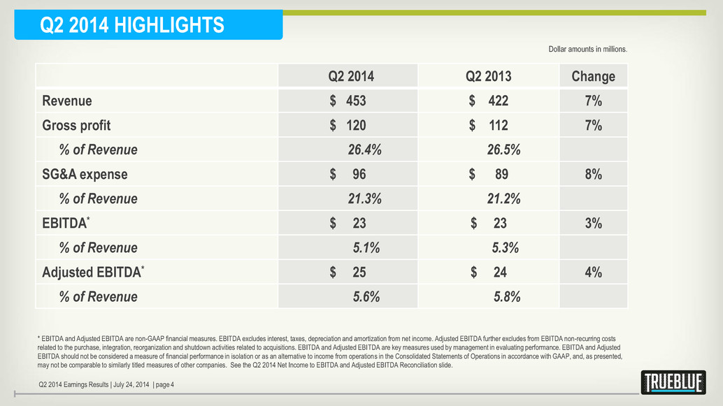 Q2 2014 HIGHLIGHTS • Total revenue growth of 7% - 2013 acquired revenue performing well - Organic revenue growth of 3%; seasonal business ramping as expected • Continued success incorporating higher statutory costs into bill rates • $5M income tax benefit from additional tax credits • $2M of deal/integration costs related to Seaton acquisition (closed first day of FYQ3) Q2 2014 Earnings Results | July 24, 2014 | page 3