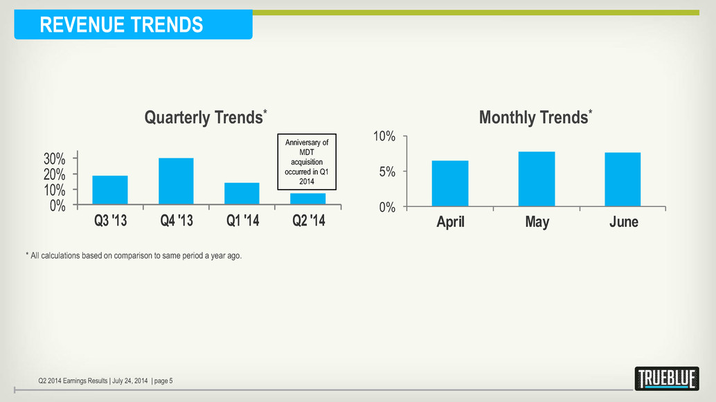 Q2 2014 HIGHLIGHTS Dollar amounts in millions. Q2 2014 Q2 2013 Change Revenue $ 453 $ 422 7% Gross profit $ 120 $ 112 7% % of Revenue 26.4% 26.5% SG&A expense $ 96 $ 89 8% % of Revenue 21.3% 21.2% EBITDA* $ 23 $ 23 3% % of Revenue 5.1% 5.3% Adjusted EBITDA* $ 25 $ 24 4% % of Revenue 5.6% 5.8% * EBITDA and Adjusted EBITDA are non-GAAP financial measures. EBITDA excludes interest, taxes, depreciation and amortization from net income. Adjusted EBITDA further excludes from EBITDA non-recurring costs related to the purchase, integration, reorganization and shutdown activities related to acquisitions. EBITDA and Adjusted EBITDA are key measures used by management in evaluating performance. EBITDA and Adjusted EBITDA should not be considered a measure of financial performance in isolation or as an alternative to income from operations in the Consolidated Statements of Operations in accordance with GAAP, and, as presented, may not be comparable to similarly titled measures of other companies. See the Q2 2014 Net Income to EBITDA and Adjusted EBITDA Reconciliation slide. Q2 2014 Earnings Results | July 24, 2014 | page 4
