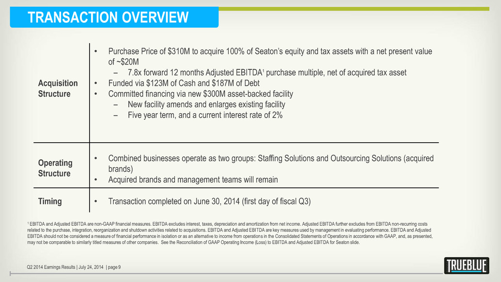 Q2 2014 Earnings Results | July 24, 2014 | page 9 Acquisition Structure • Purchase Price of $310M to acquire 100% of Seaton’s equity and tax assets with a net present value of ~$20M – 7.8x forward 12 months Adjusted EBITDA1 purchase multiple, net of acquired tax asset • Funded via $123M of Cash and $187M of Debt • Committed financing via new $300M asset-backed facility – New facility amends and enlarges existing facility – Five year term, and a current interest rate of 2% Operating Structure • Combined businesses operate as two groups: Staffing Solutions and Outsourcing Solutions (acquired brands) • Acquired brands and management teams will remain Timing • Transaction completed on June 30, 2014 (first day of fiscal Q3) TRANSACTION OVERVIEW 1 EBITDA and Adjusted EBITDA are non-GAAP financial measures. EBITDA excludes interest, taxes, depreciation and amortization from net income. Adjusted EBITDA further excludes from EBITDA non-recurring costs related to the purchase, integration, reorganization and shutdown activities related to acquisitions. EBITDA and Adjusted EBITDA are key measures used by management in evaluating performance. EBITDA and Adjusted EBITDA should not be considered a measure of financial performance in isolation or as an alternative to income from operations in the Consolidated Statements of Operations in accordance with GAAP, and, as presented, may not be comparable to similarly titled measures of other companies. See the Reconciliation of GAAP Operating Income (Loss) to EBITDA and Adjusted EBITDA for Seaton slide.