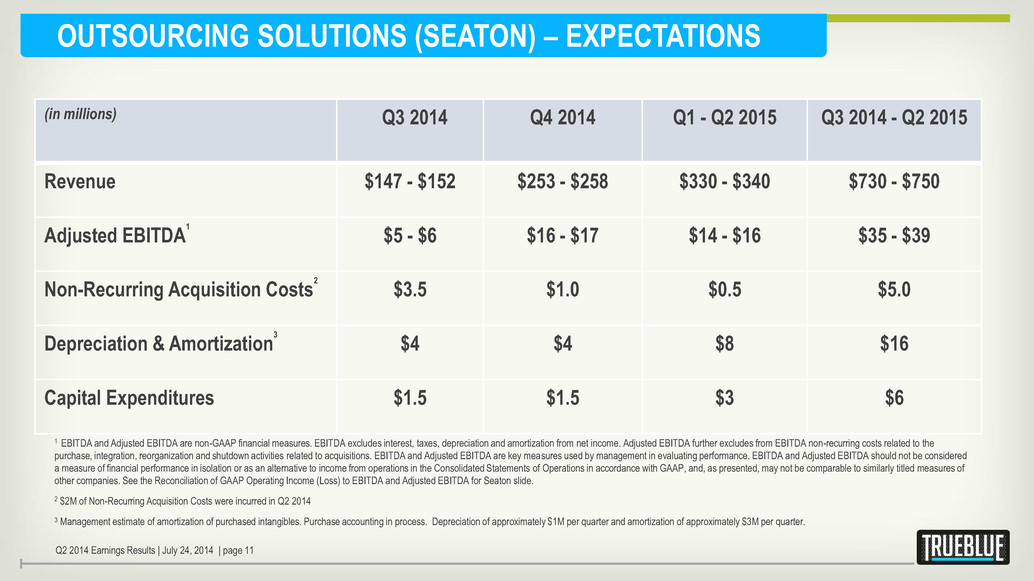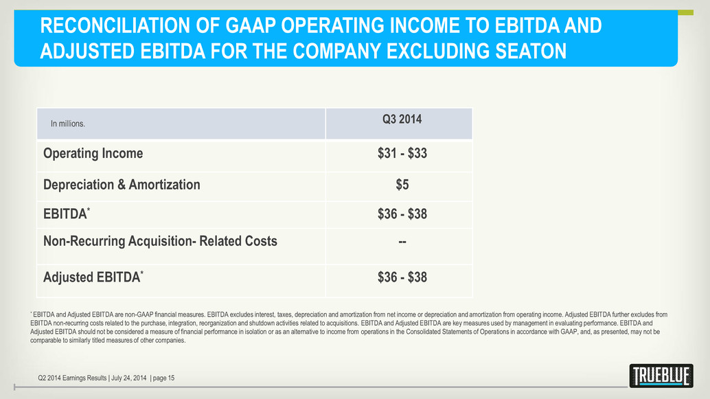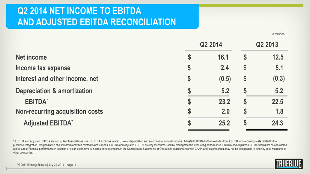 In millions except per share data. Certain amounts may not sum or recalculate due to rounding. 1 EBITDA and Adjusted EBITDA are non-GAAP financial measures. EBITDA excludes interest, taxes, depreciation and amortization from net income. Adjusted EBITDA further excludes from EBITDA non-recurring costs related to the purchase, integration, reorganization and shutdown activities related to acquisitions. EBITDA and Adjusted EBITDA are key measures used by management in evaluating performance. EBITDA and Adjusted EBITDA should not be considered a measure of financial performance in isolation or as an alternative to income from operations in the Consolidated Statements of Operations in accordance with GAAP, and, as presented, may not be comparable to similarly titled measures of other companies. See the Reconciliation of GAAP Operating Income (Loss) to EBITDA and Adjusted EBITDA for Seaton and the Reconciliation of GAAP Operating Income to EBITDA and Adjusted EBITDA for the Company Excluding Seaton slides. Q3 2014 EXPECTATIONS Q2 2014 Earnings Results | July 24, 2014 | page 13 Consolidated Total Revenue $ 634 - 647 Total Growth 42% Diluted EPS $ 0.38 - $0.46 Adjusted EBITDA 1 $ 40 - 45 Non-recurring acquisition costs $ 3.5 Staffing Solutions Outsourcing Solutions Revenue $ 485 - 495 $ 147 - 152 Organic Growth 4% Adjusted EBITDA 1 $ 36 - 38 $ 5 - 6