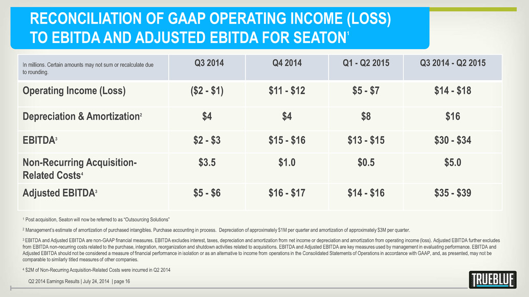 RECONCILIATION OF GAAP OPERATING INCOME TO EBITDA AND ADJUSTED EBITDA FOR THE COMPANY EXCLUDING SEATON * EBITDA and Adjusted EBITDA are non-GAAP financial measures. EBITDA excludes interest, taxes, depreciation and amortization from net income or depreciation and amortization from operating income. Adjusted EBITDA further excludes from EBITDA non-recurring costs related to the purchase, integration, reorganization and shutdown activities related to acquisitions. EBITDA and Adjusted EBITDA are key measures used by management in evaluating performance. EBITDA and Adjusted EBITDA should not be considered a measure of financial performance in isolation or as an alternative to income from operations in the Consolidated Statements of Operations in accordance with GAAP, and, as presented, may not be comparable to similarly titled measures of other companies. Q2 2014 Earnings Results | July 24, 2014 | page 15 Q3 2014 Operating Income $31 - $33 Depreciation & Amortization $5 EBITDA* $36 - $38 Non-Recurring Acquisition- Related Costs -- Adjusted EBITDA* $36 - $38 In millions.
