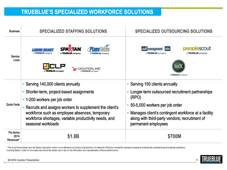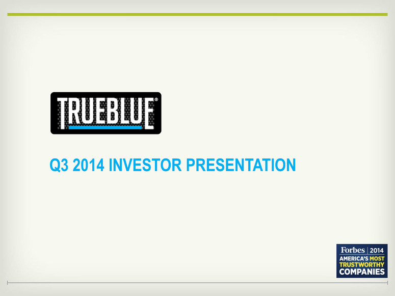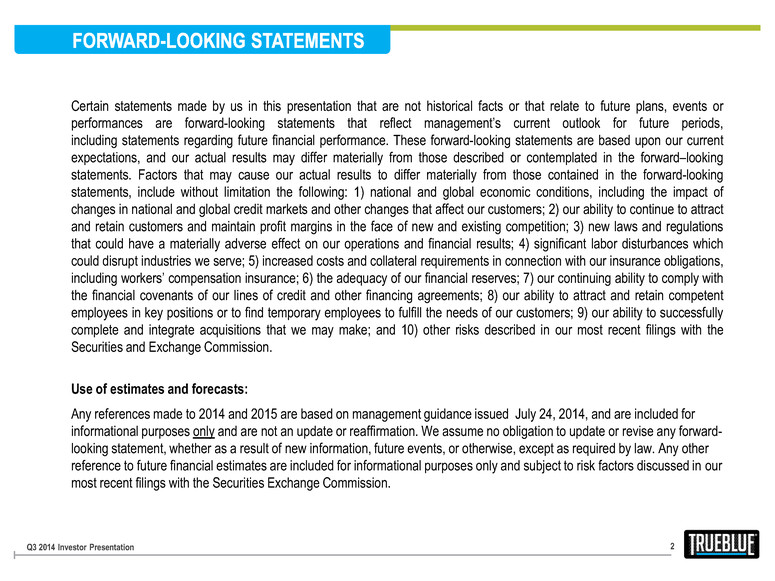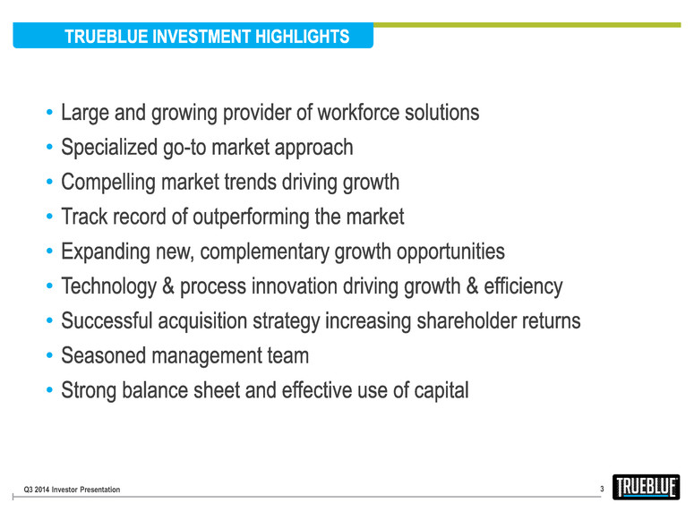 Q3 2014 Investor Presentation 2 Certain statements made by us in this presentation that are not historical facts or that relate to future plans, events or performances are forward-looking statements that reflect management’s current outlook for future periods, including statements regarding future financial performance. These forward-looking statements are based upon our current expectations, and our actual results may differ materially from those described or contemplated in the forward–looking statements. Factors that may cause our actual results to differ materially from those contained in the forward-looking statements, include without limitation the following: 1) national and global economic conditions, including the impact of changes in national and global credit markets and other changes that affect our customers; 2) our ability to continue to attract and retain customers and maintain profit margins in the face of new and existing competition; 3) new laws and regulations that could have a materially adverse effect on our operations and financial results; 4) significant labor disturbances which could disrupt industries we serve; 5) increased costs and collateral requirements in connection with our insurance obligations, including workers’ compensation insurance; 6) the adequacy of our financial reserves; 7) our continuing ability to comply with the financial covenants of our lines of credit and other financing agreements; 8) our ability to attract and retain competent employees in key positions or to find temporary employees to fulfill the needs of our customers; 9) our ability to successfully complete and integrate acquisitions that we may make; and 10) other risks described in our most recent filings with the Securities and Exchange Commission. Use of estimates and forecasts: Any references made to 2014 and 2015 are based on management guidance issued July 24, 2014, and are included for informational purposes only and are not an update or reaffirmation. We assume no obligation to update or revise any forward- looking statement, whether as a result of new information, future events, or otherwise, except as required by law. Any other reference to future financial estimates are included for informational purposes only and subject to risk factors discussed in our most recent filings with the Securities Exchange Commission.