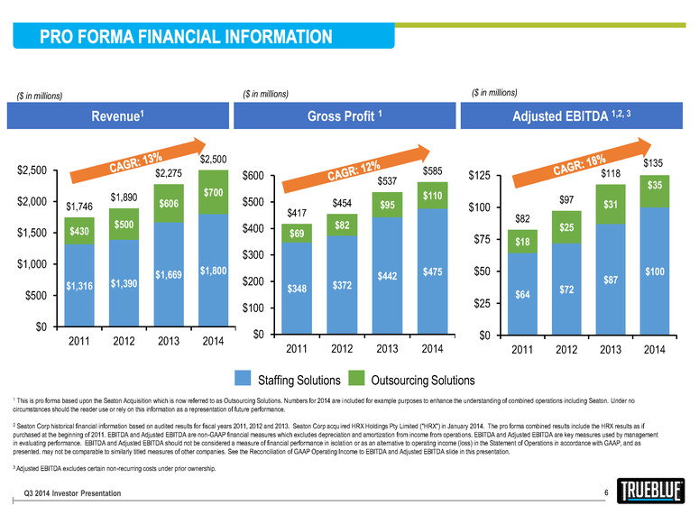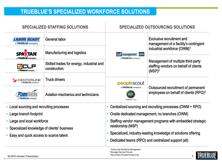 SPECIALIZED STAFFING SOLUTIONS SPECIALIZED OUTSOURCING SOLUTIONS • • • • • • • • $1.8B $700M Q3 2014 Investor Presentation 4 1 This is pro forma based upon the Seaton Acquisition which is now referred to as Outsourcing Solutions. Numbers for 2014 are included for example purposes to enhance the understanding of combined operations including Seaton. Under no circumstances should the reader use or rely on this information as a representation of future performance.