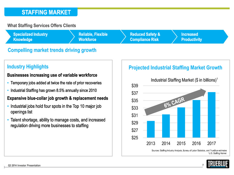 $1,316 $1,390 $1,669 $1,800 $430 $500 $606 $700 $1,746 $1,890 $2,275 $2,500 $0 $500 $1,000 $1,500 $2,000 $2,500 2011 2012 2013 2014 ($ in millions) Revenue1 Gross Profit 1 Adjusted EBITDA 1,2, 3 ($ in millions) ($ in millions) $348 $372 $442 $475 $69 $82 $95 $110 $417 $454 $537 $585 $0 $100 $200 $300 $400 $500 $600 2011 2012 2013 2014 $64 $72 $87 $100 $18 $25 $31 $35 $82 $97 $118 $0 $25 $50 $75 $100 $125 2011 2012 2013 2014 Staffing Solutions Outsourcing Solutions 1 This is pro forma based upon the Seaton Acquisition which is now referred to as Outsourcing Solutions. Numbers for 2014 are included for example purposes to enhance the understanding of combined operations including Seaton. Under no circumstances should the reader use or rely on this information as a representation of future performance. 2 Seaton Corp historical financial information based on audited results for fiscal years 2011, 2012 and 2013. Seaton Corp acqu ired HRX Holdings Pty Limited ("HRX") in January 2014. The pro forma combined results include the HRX results as if purchased at the beginning of 2011. EBITDA and Adjusted EBITDA are non-GAAP financial measures which excludes depreciation and amortization from income from operations. EBITDA and Adjusted EBITDA are key measures used by management in evaluating performance. EBITDA and Adjusted EBITDA should not be considered a measure of financial performance in isolation or as an alternative to operating income (loss) in the Statement of Operations in accordance with GAAP, and as presented. may not be comparable to similarly titled measures of other companies. See the Reconciliation of GAAP Operating Income to EBITDA and Adjusted EBITDA slide in this presentation. 3 Adjusted EBITDA excludes certain non-recurring costs under prior ownership. $135 Q3 2014 Investor Presentation 6