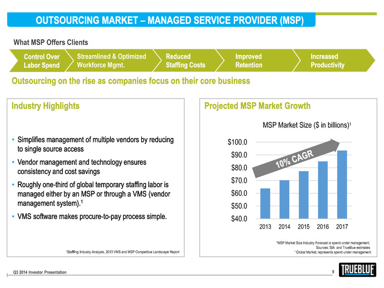 OUTSOURCING MARKET - OUTSOURCED WORKFORCE MANAGEMENT (OWM) Outsourcing on the rise as companies focus on their core business • • • • • What OWM Offers Clients Sources: SIA, BLS and TrueBlue Estimates 1 US Staffing Market; Logistics and Manufacturing is a subset of the Industrial Staffing Market Q3 2014 Investor Presentation 8