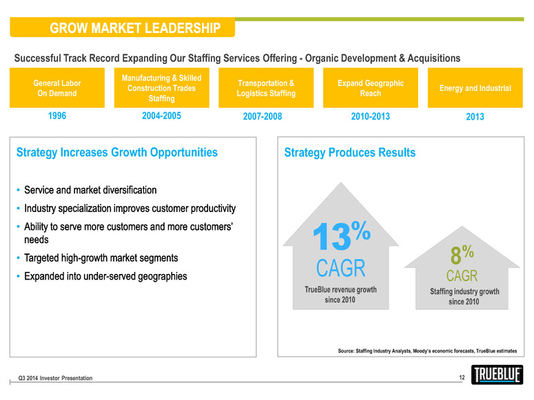 • Effectively use capital to increase shareholder returns • Add industry leading talent, ensure strong cultural fit • Integrate similar offerings and processes, leverage best practices, preserve differentiated expertise • Increase talent acquisition capabilities with mobile and online sourcing and hiring • Enhance efficiency with online business processes • Reduce fixed costs through centralized recruiting and service delivery • Expand into attractive, complementary human capital solutions • Enhance knowledge leadership, differentiated expertise and service levels • Be a leader in providing innovative solutions and services • Expand leadership position in industrial staffing • Increase service offerings and new geographies to meet more customer needs Q3 2014 Investor Presentation 11
