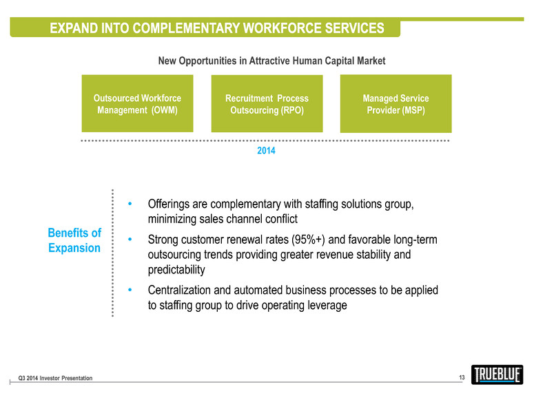 Q3 2014 Investor Presentation 12 Strategy Produces Results Strategy Increases Growth Opportunities • • • • • Successful Track Record Expanding Our Staffing Services Offering - Organic Development & Acquisitions 1996 2004-2005 2007-2008 2010-2013 2013 General Labor On Demand Manufacturing & Skilled Construction Trades Staffing Transportation & Logistics Staffing Expand Geographic Reach Energy and Industrial Source: Staffing Industry Analysts, Moody’s economic forecasts, TrueBlue estimates