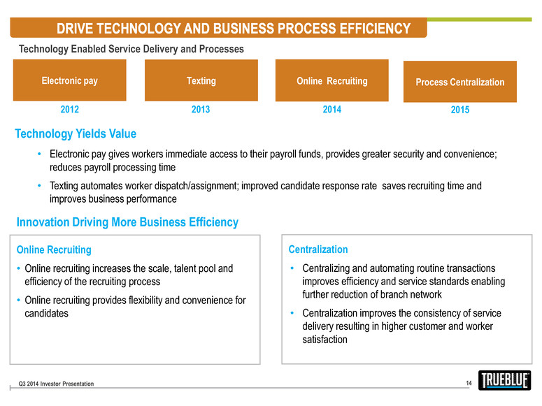 New Opportunities in Attractive Human Capital Market • Offerings are complementary with staffing solutions group, minimizing sales channel conflict • Strong customer renewal rates (95%+) and favorable long-term outsourcing trends providing greater revenue stability and predictability • Centralization and automated business processes to be applied to staffing group to drive operating leverage Benefits of Expansion Outsourced Workforce Management (OWM) Recruitment Process Outsourcing (RPO) Managed Service Provider (MSP) 2014 Q3 2014 Investor Presentation 13