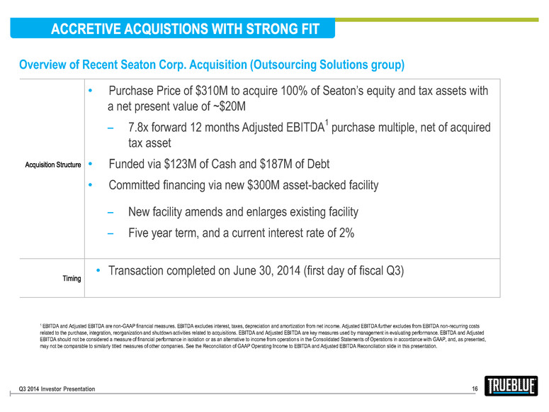 TrueBlue 2011 Seaton 20112 Combined TrueBlue 2012 Seaton 2012 2 Combined TrueBlue 2013 Seaton 2013 2 Combined Seaton Q3 2014E- Q2 2015E Adjustments to EBITDA: 1 EBITDA and Adjusted EBITDA are non-GAAP financial measures which excludes depreciation and amortization from income from operations. EBITDA and Adjusted EBITDA are key measures used by management in evaluating performance. EBITDA and Adjusted EBITDA should not be considered a measure of financial performance in isolation or as an alternative to operating income (loss) in the Statement of Operations in accordance with GAAP, and as presented. may not be comparable to similarly titled measures of other companies. 2 Seaton Corp historical financial information based on audited results for fiscal years 2011, 2012 and 2013. Seaton Corp acquired HRX Holdings Pty Limited ("HRX") in January 2014. The pro forma combined results include the HRX results as if purchased at the beginning of 2011. 3 Adjusted EBITDA excludes certain non-recurring costs under prior ownership. 4 Adjusted EBITDA excludes costs related to the purchase and integration activities of the MDT and TWC acquisitions in 2013 and Seaton in 2014. Total purchase and integration related costs for Seaton are estimated to be $7 million of which $2 million was incurred prior to the acquisition in Q2 of 2014 and $0.5 million expected in Q1 2015. Q3 2014 Investor Presentation 22