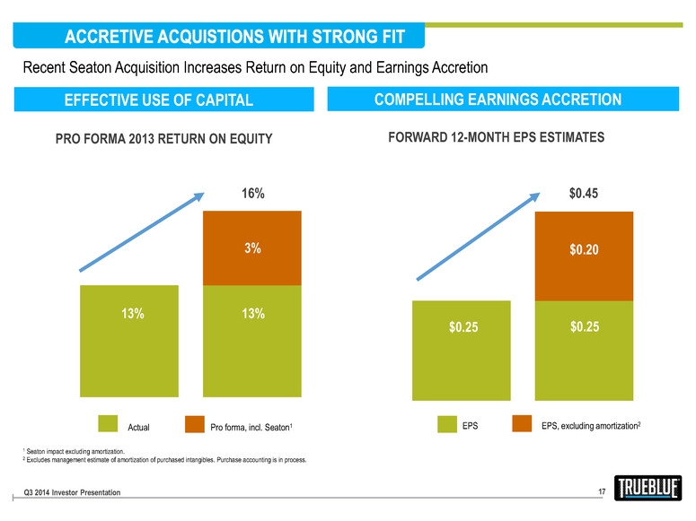 • Purchase Price of $310M to acquire 100% of Seaton’s equity and tax assets with a net present value of ~$20M – 7.8x forward 12 months Adjusted EBITDA 1 purchase multiple, net of acquired tax asset • Funded via $123M of Cash and $187M of Debt • Committed financing via new $300M asset-backed facility – New facility amends and enlarges existing facility – Five year term, and a current interest rate of 2% • Transaction completed on June 30, 2014 (first day of fiscal Q3) Q3 2014 Investor Presentation 16 Overview of Recent Seaton Corp. Acquisition (Outsourcing Solutions group) 1 EBITDA and Adjusted EBITDA are non-GAAP financial measures. EBITDA excludes interest, taxes, depreciation and amortization from net income. Adjusted EBITDA further excludes from EBITDA non-recurring costs related to the purchase, integration, reorganization and shutdown activities related to acquisitions. EBITDA and Adjusted EBITDA are key measures used by management in evaluating performance. EBITDA and Adjusted EBITDA should not be considered a measure of financial performance in isolation or as an alternative to income from operations in the Consolidated Statements of Operations in accordance with GAAP, and, as presented, may not be comparable to similarly titled measures of other companies. See the Reconciliation of GAAP Operating Income to EBITDA and Adjusted EBITDA Reconciliation slide in this presentation.