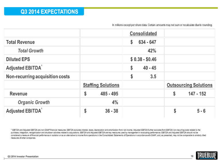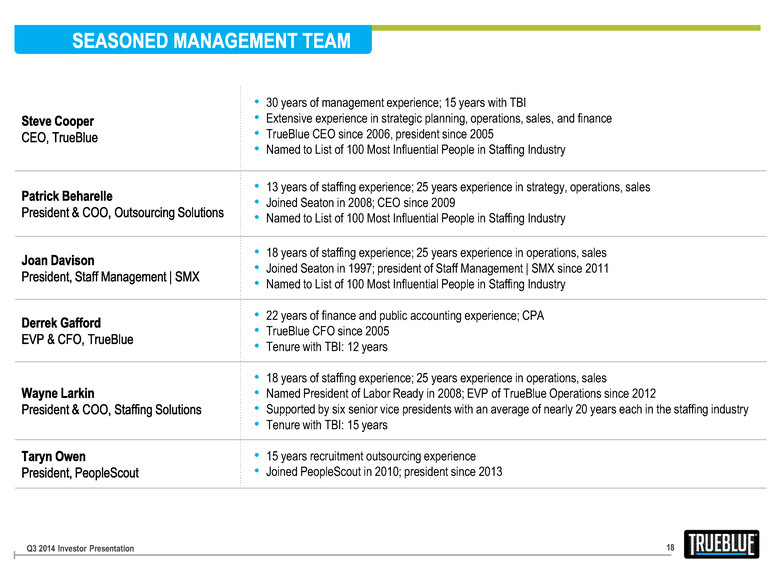 • 30 years of management experience; 15 years with TBI • Extensive experience in strategic planning, operations, sales, and finance • TrueBlue CEO since 2006, president since 2005 • Named to List of 100 Most Influential People in Staffing Industry • 13 years of staffing experience; 25 years experience in strategy, operations, sales • Joined Seaton in 2008; CEO since 2009 • Named to List of 100 Most Influential People in Staffing Industry • 18 years of staffing experience; 25 years experience in operations, sales • Joined Seaton in 1997; president of Staff Management | SMX since 2011 • Named to List of 100 Most Influential People in Staffing Industry • 22 years of finance and public accounting experience; CPA • TrueBlue CFO since 2005 • Tenure with TBI: 12 years • 18 years of staffing experience; 25 years experience in operations, sales • Named President of Labor Ready in 2008; EVP of TrueBlue Operations since 2012 • Supported by six senior vice presidents with an average of nearly 20 years each in the staffing industry • Tenure with TBI: 15 years • 15 years recruitment outsourcing experience • Joined PeopleScout in 2010; president since 2013 Q3 2014 Investor Presentation 18