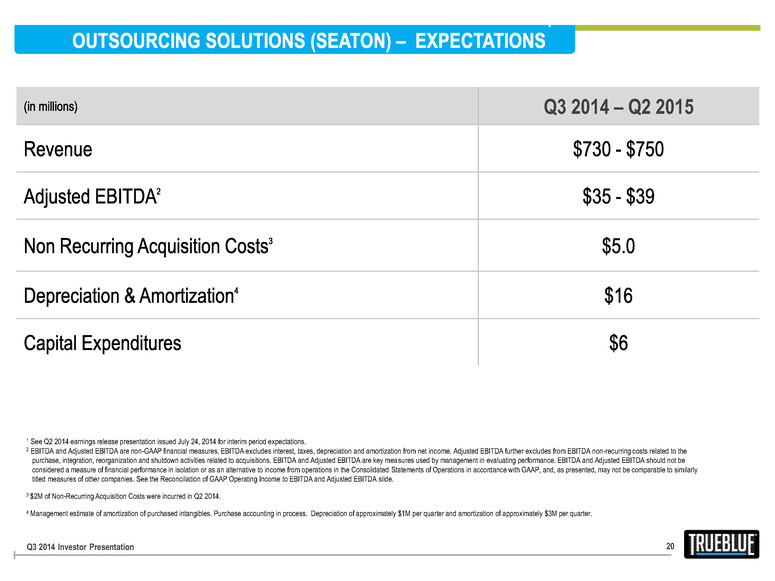 Q3 2014 Investor Presentation 19 1 EBITDA and Adjusted EBITDA are non-GAAP financial measures. EBITDA excludes interest, taxes, depreciation and amortization from net income. Adjusted EBITDA further excludes from EBITDA non-recurring costs related to the purchase, integration, reorganization and shutdown activities related to acquisitions. EBITDA and Adjusted EBITDA are key measures used by management in evaluating performance. EBITDA and Adjusted EBITDA should not be considered a measure of financial performance in isolation or as an alternative to income from operations in the Consolidated Statements of Operations in accordance with GAAP, and, as presented, may not be comparable to similarly titled measures of other companies.