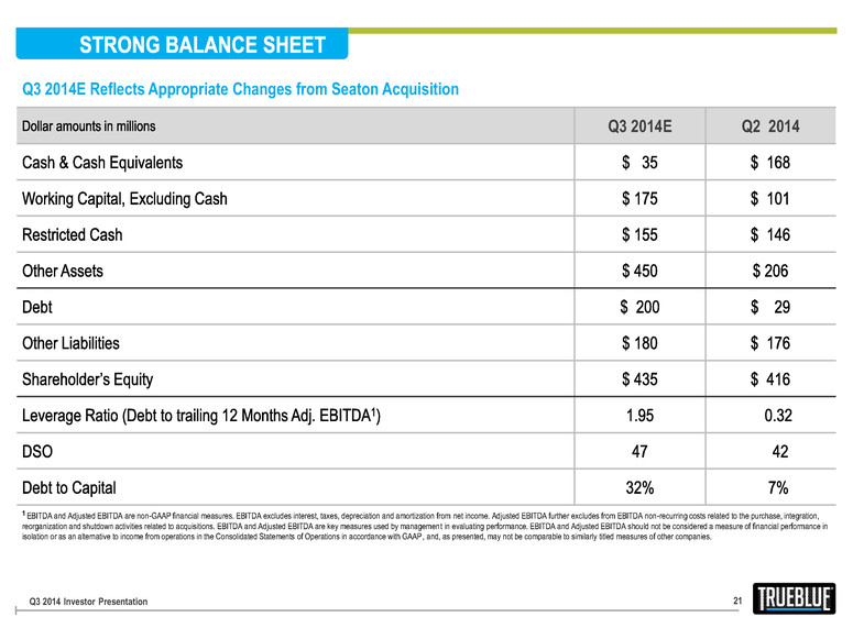 Q3 2014 – Q2 2015 Q3 2014 Investor Presentation 20 1 See Q2 2014 earnings release presentation issued July 24, 2014 for interim period expectations. 2 EBITDA and Adjusted EBITDA are non-GAAP financial measures. EBITDA excludes interest, taxes, depreciation and amortization from net income. Adjusted EBITDA further excludes from EBITDA non-recurring costs related to the purchase, integration, reorganization and shutdown activities related to acquisitions. EBITDA and Adjusted EBITDA are key measures used by management in evaluating performance. EBITDA and Adjusted EBITDA should not be considered a measure of financial performance in isolation or as an alternative to income from operations in the Consolidated Statements of Operations in accordance with GAAP, and, as presented, may not be comparable to similarly titled measures of other companies. See the Reconciliation of GAAP Operating Income to EBITDA and Adjusted EBITDA slide. 3 $2M of Non-Recurring Acquisition Costs were incurred in Q2 2014. 4 Management estimate of amortization of purchased intangibles. Purchase accounting in process. Depreciation of approximately $1M per quarter and amortization of approximately $3M per quarter.